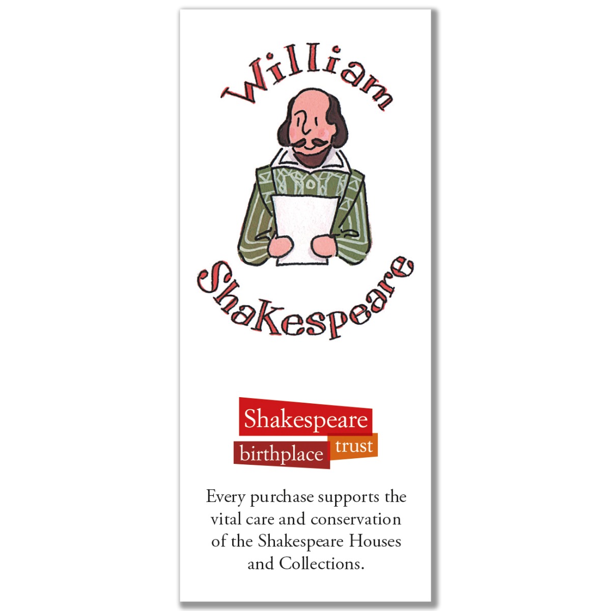 Book mark with an illustration of William Shakespeare. Text reads Shakespeare Birthplace Trust. Every purchase supports the vital care and conservation of Shakespeare Houses and Collections.