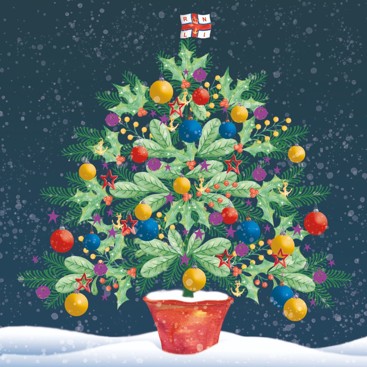 Image of a Christmas tree decorated with sprigs of holly and mistletoe with their red and yellow berries, colourful baubles, stars and yellow anchor shaped decorations. The tree is top with a RNLI flag fluttering in the wind. Snow falls all around against