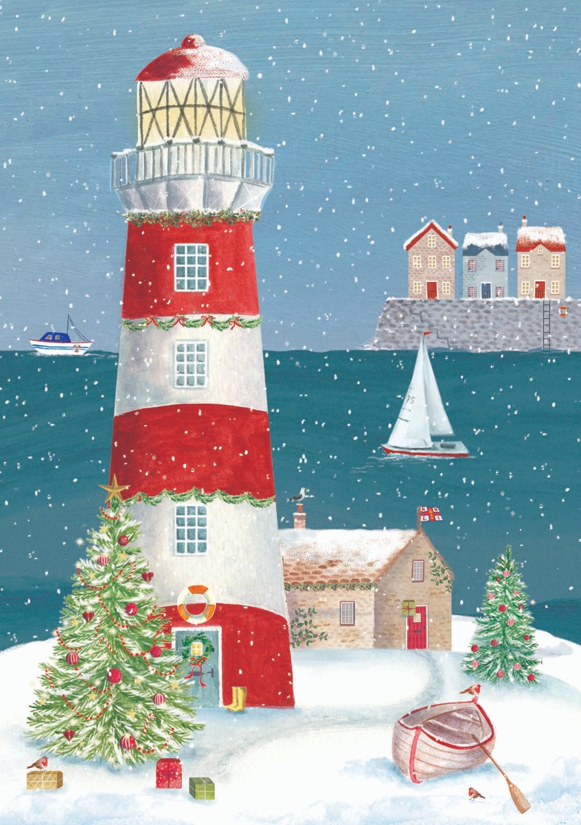 Image of a red and white striped lighthouse decorated for Christmas with festive garlands and a wreath on the door. A beautifully decorated tree sits at the entrance beside a pair of yellow wellies. Beneath the tree are three gifts and a little robin red