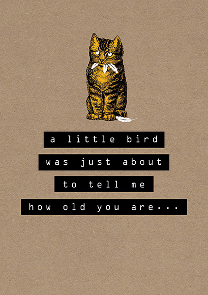 This funny, modern birthday card features a naughty ginger cat on a kraft background with the cheeky slogan ‘a little bird was just about to tell me how old you are…’