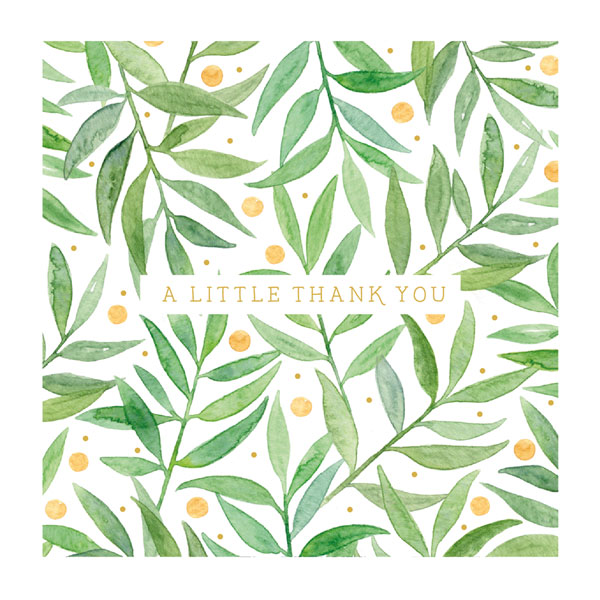 A beautiful thank you card featuring green foliage, orange berries and delicate golden dots. Text reads ‘A little thank you’.