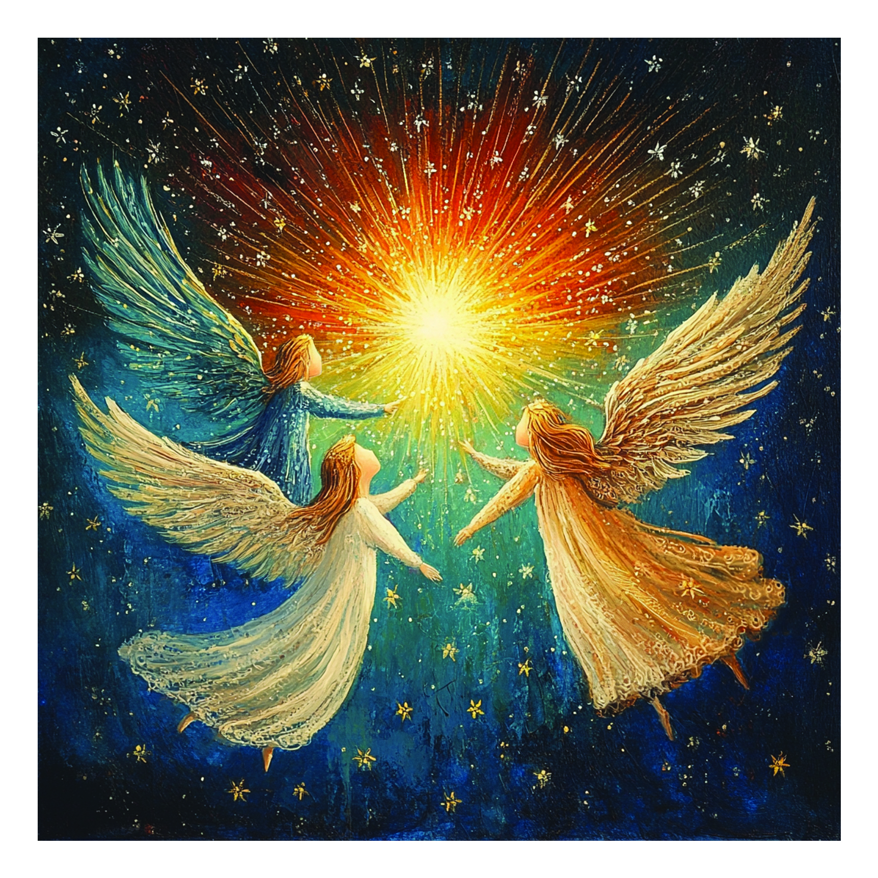 A radiant Christmas card showing three angels reaching toward a glowing star in a star-filled night sky.