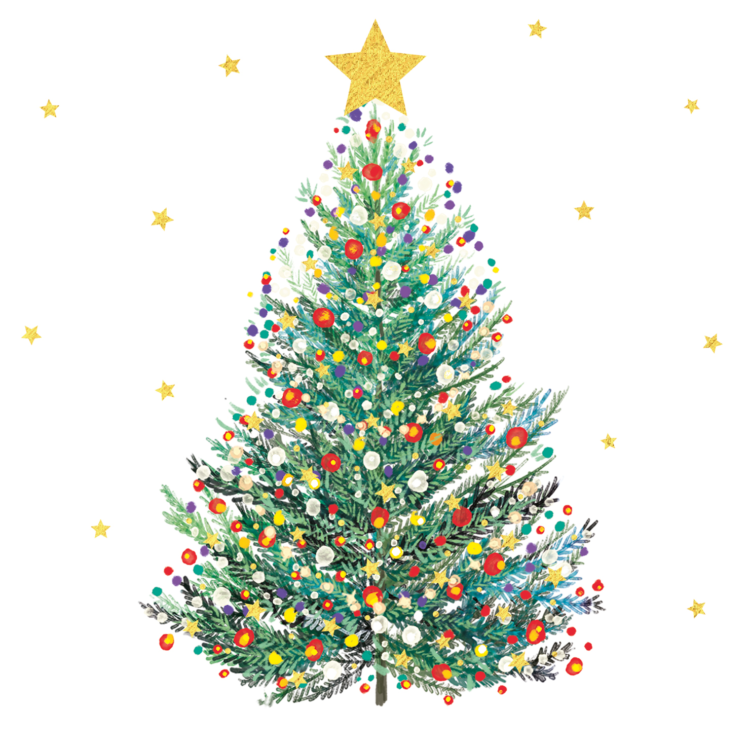 Christmas card with an image of a decorated Christmas tree and big gold star on top