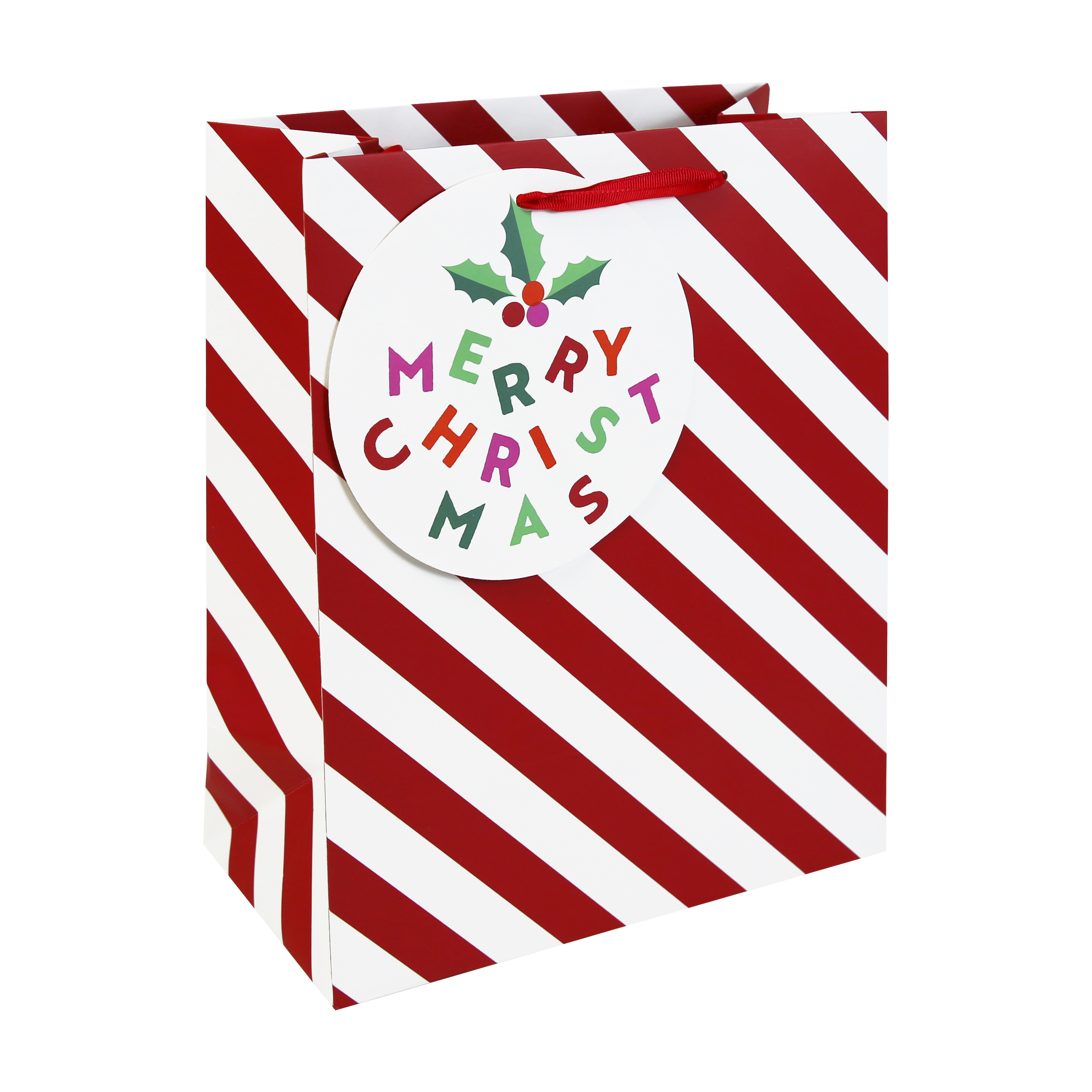 Bold red and white striped large gift bag with a “Merry Christmas” tag and holly detail—perfect for larger festive gifts.