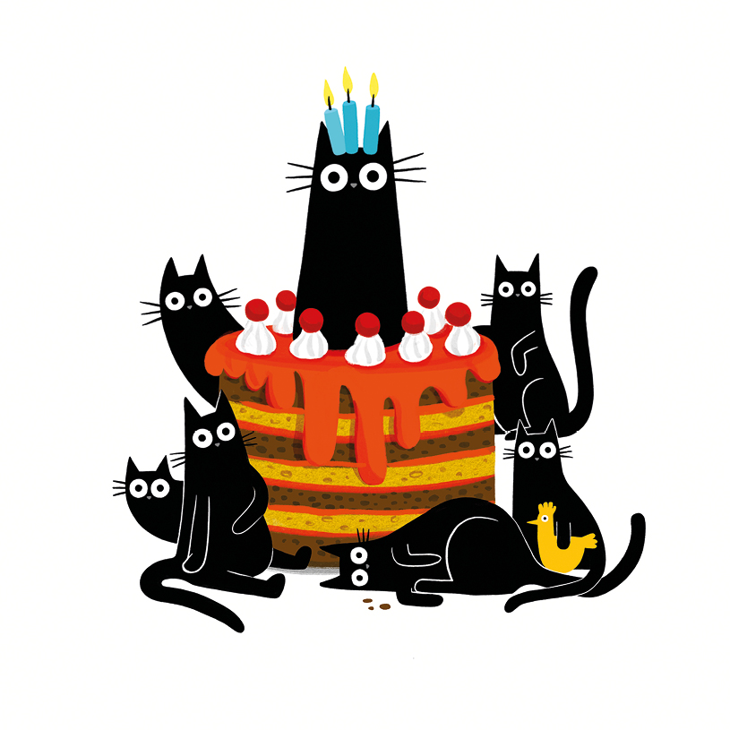 A group of Black Cats enjoying a large Birthday Cake