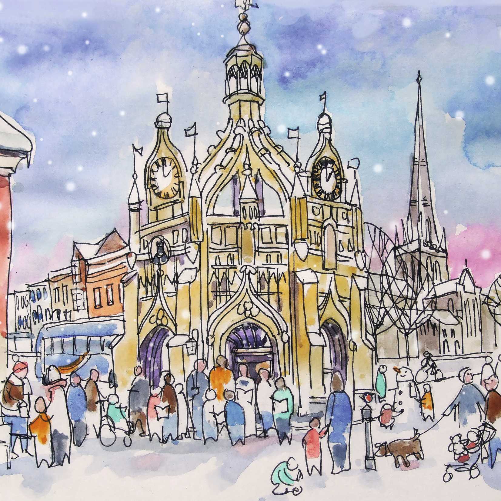 These Christmas cards feature a sketch by Lyndsey Smith of Chichester Cross in the snow, surrounded by Christmas shoppers.