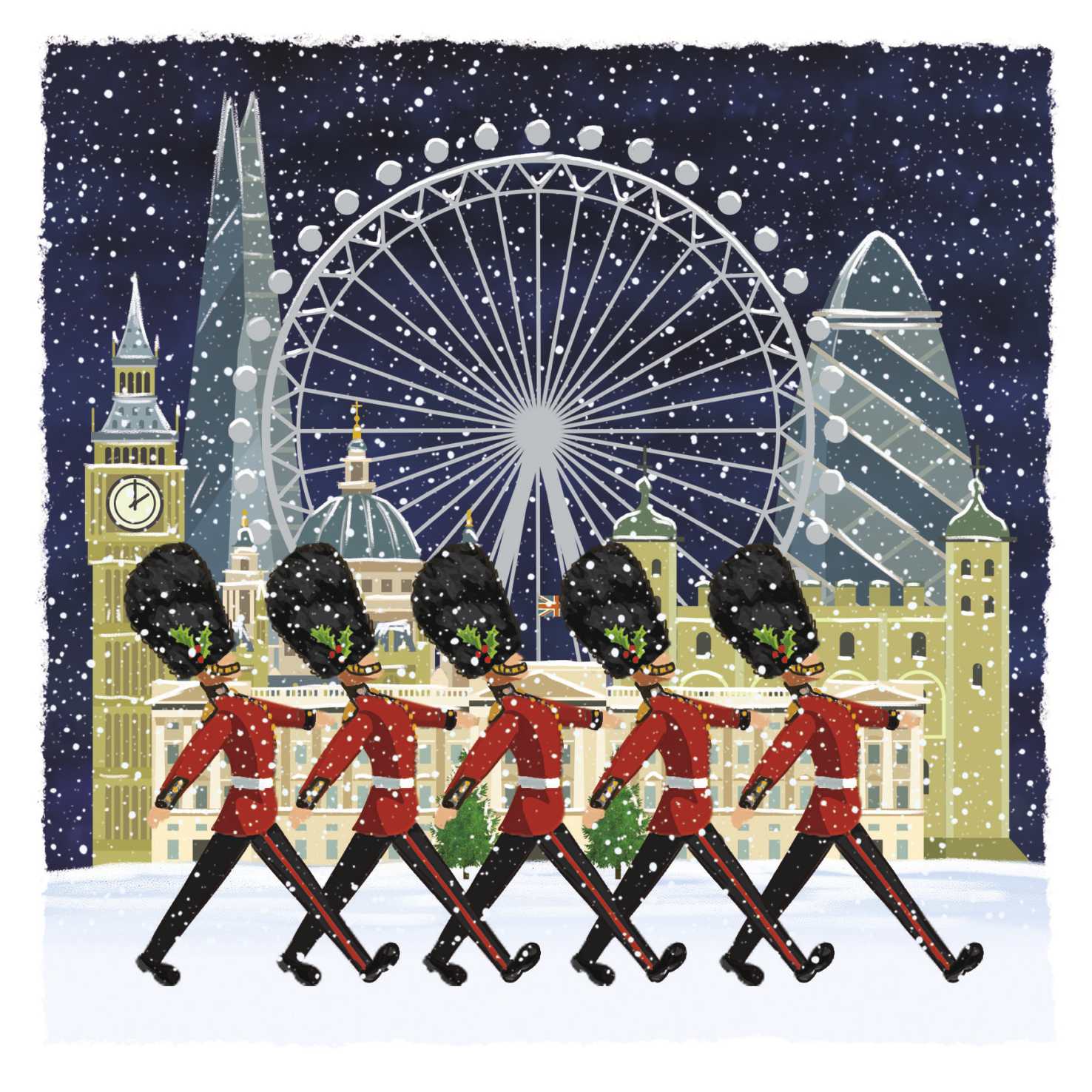 Send your season’s greetings with these charity Christmas cards which feature an illustration of British Foot Guards marching in front of Buckingham Palace and other iconic buildings in the city of London.