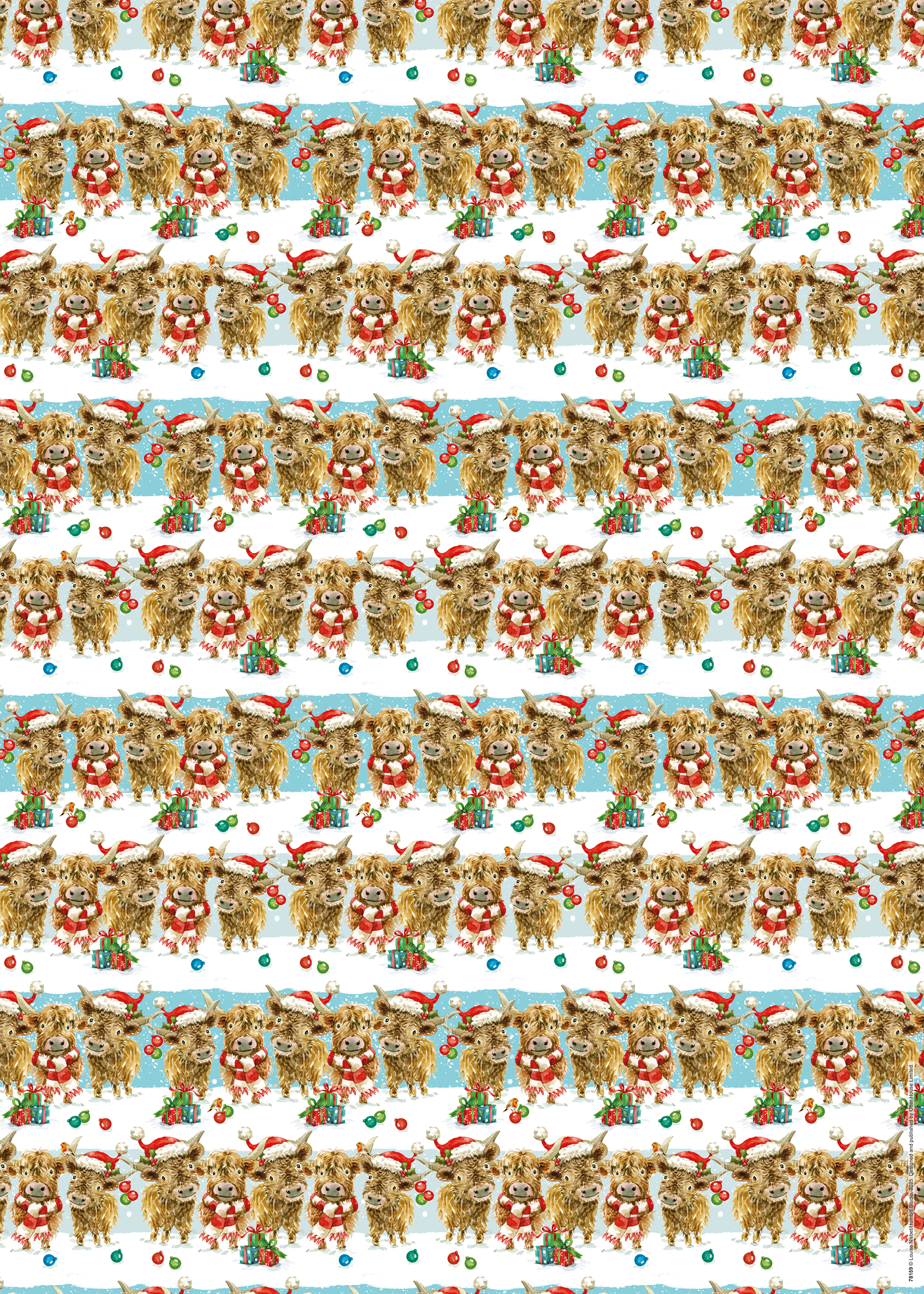 Pack of Christmas gift wrap and tags featuring cartoon highland cows in scarves and Santa hats with festive decorations on a snowy background.