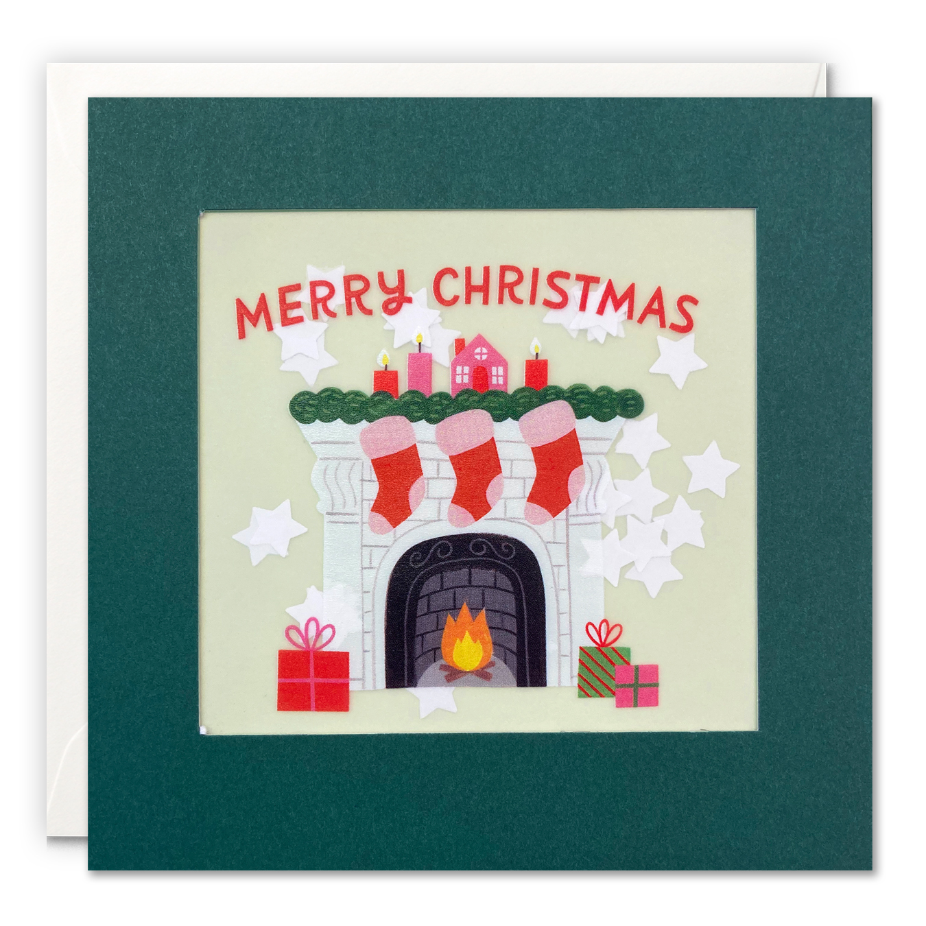 This is a hand-finished Christmas card illustrated by Jacqui Lee. The image on the front of the card shows a brick fireplace with three red and pink stockings hanging from the middle. The mantlepiece is adorned with a foliage garland, candles and Christmas house decoration. Presents sit at the foot of the fireplace. Yellow and orange flames flicker in the hearth,