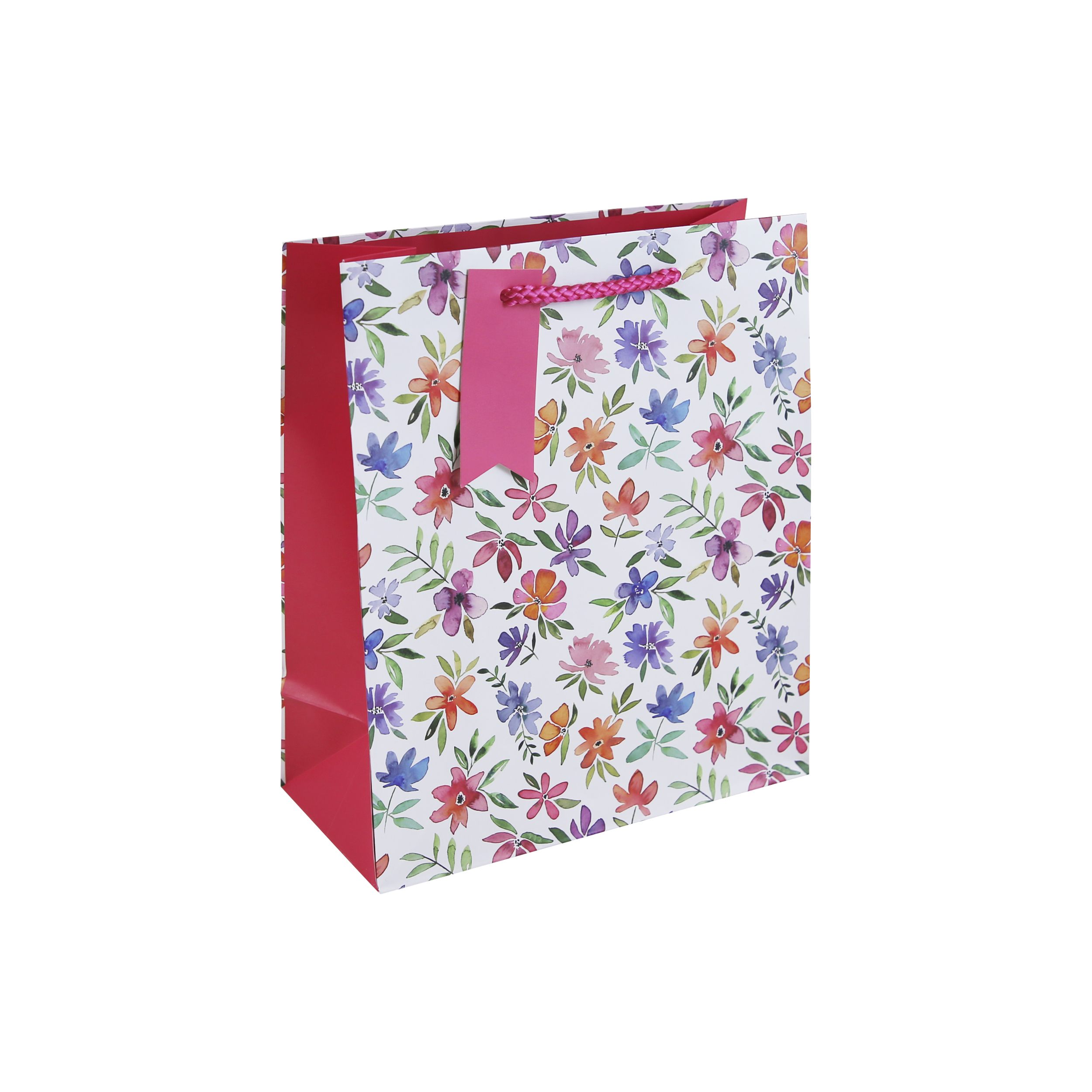 A white gift bag decorated with colourful flowers, pink side panels, and a pink braided handle with tag.