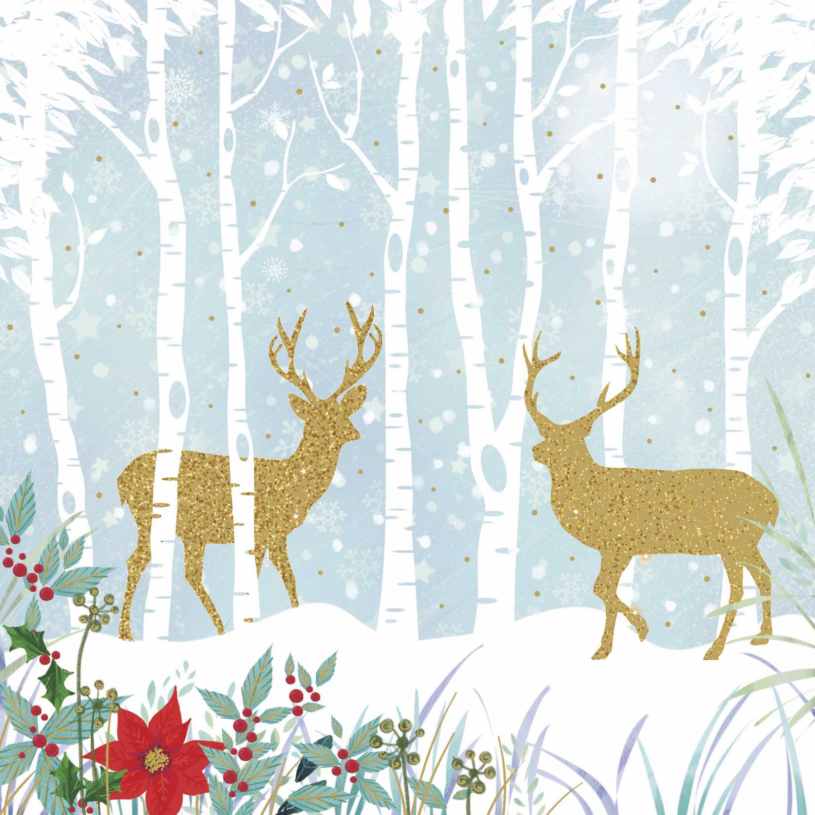 These Christmas cards feature two golden stags with a glittery-style pattern walking through a snowy forest of silver birch trees.