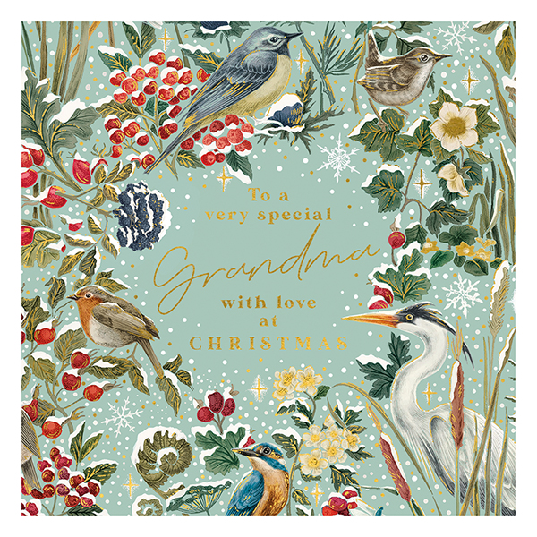A charming woodland Christmas card for Grandma, featuring birds, winter foliage, and snowflakes on a soft green background. A heartfelt way to share festive love.