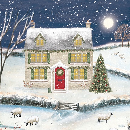 This is the perfect Christmas card to send Christmas wishes and season’s greetings to family and friends this year. As the snow falls heavily across the countryside your eyes are drawn to the cosy welcoming cottage all decked out in Christmas decorations. Garlands line the windows and a festive wreath hangs on the bright red door, beside which sits a pair of wellie boots. The beautiful tree stands tall outside with its colourful lights and baubles, its branches glistening with snow. Sheep graze peacefully in the fields around and the moon lights up the night sky.