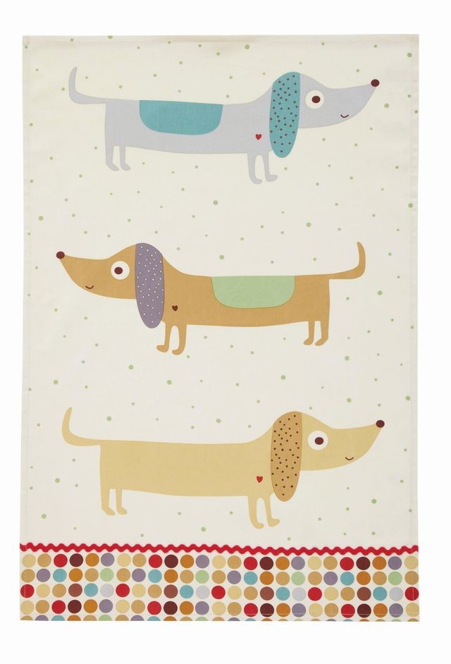 Tea towel with three sausage dogs with little red hearts on their chests. A colourful pattern of spots runs along the bottom of the towel.