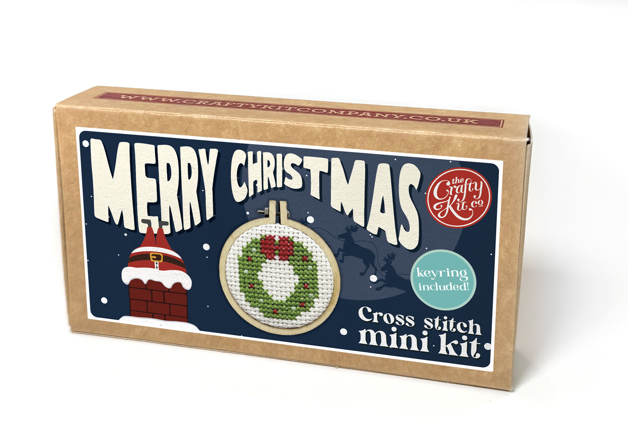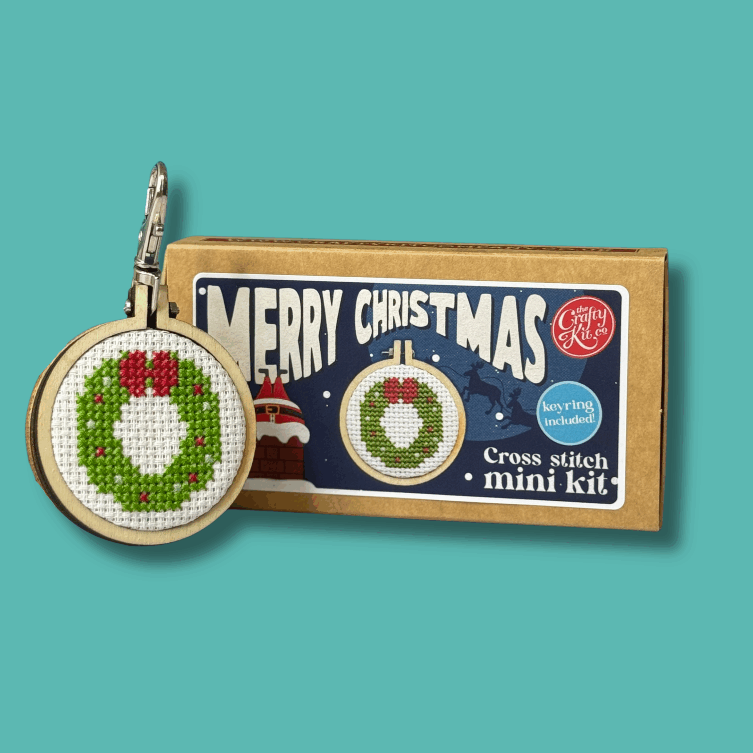 A cheerful cross stitch kit with a festive wreath design in a mini embroidery hoop, plus keyring, perfect for handmade Christmas gifting or seasonal crafting.