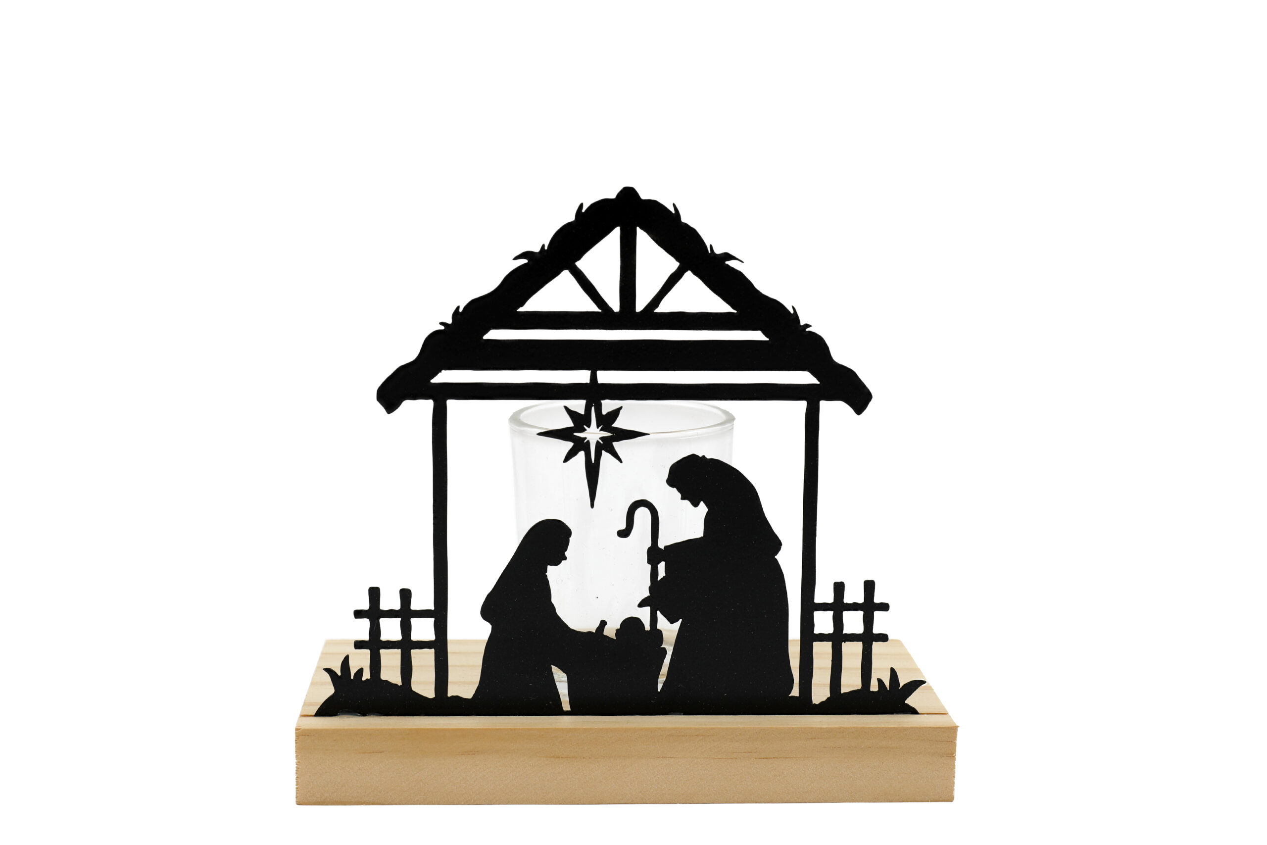 A wooden and iron candle holder featuring the nativity scene and a glass to hold a tealight.