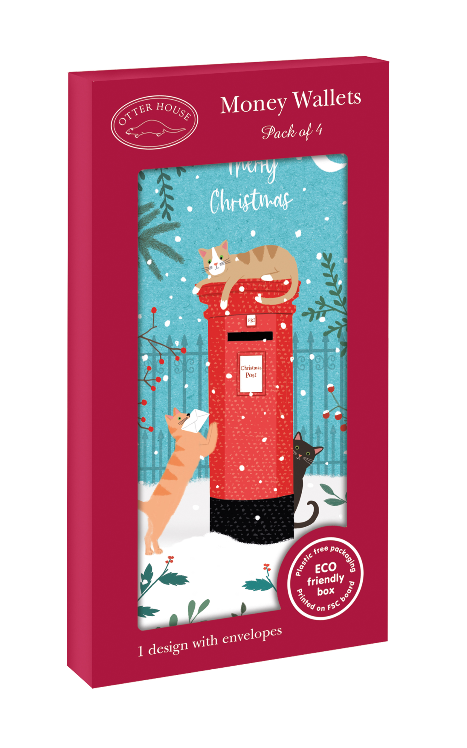 Add a touch of charm to your Christmas gifting with this delightful pack of 4 money wallets. Each wallet showcases a snowy winter scene with curious cats climbing and lounging around a traditional red postbox, ready to send festive cheer. With one enchanting design and matching envelopes included, these wallets are perfect for presenting cash, gift cards or heartfelt messages. Printed on FSC-certified card with eco-friendly packaging, they’re a thoughtful choice for animal lovers and stationery fans alike.