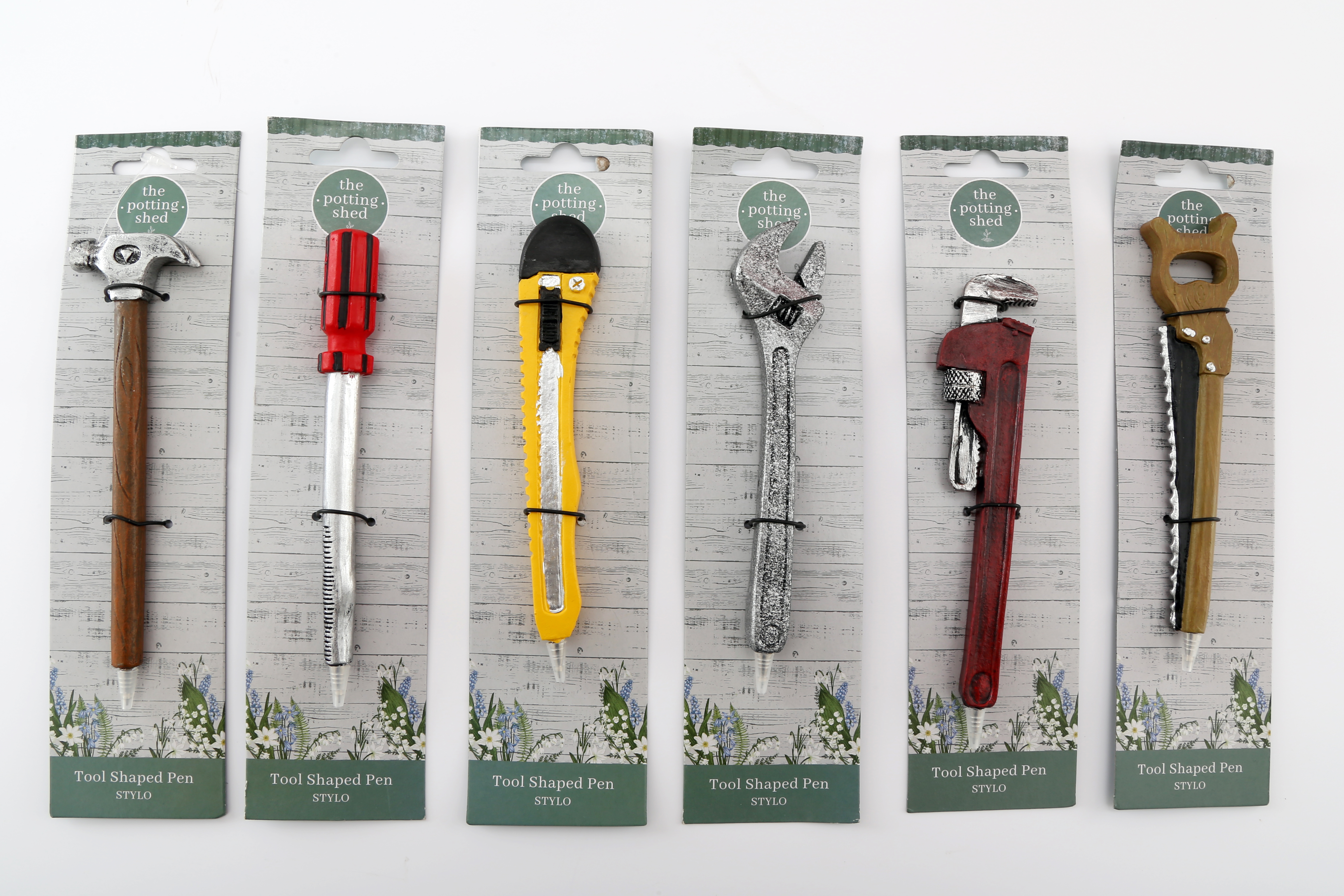 A selection of novelty pens shaped like tools such as a hammer, screwdriver, spanner and more.