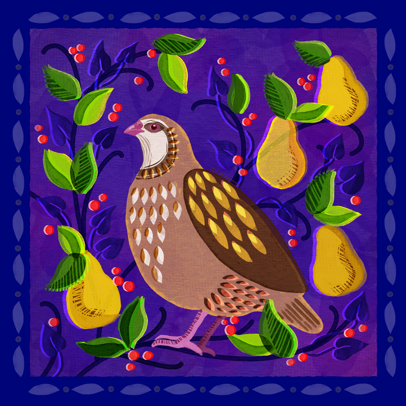 This vibrant Christmas card features a partridge surrounded by pears, green leaves, and red berries, set against a rich purple background with a decorative blue border. Inspired by the “Twelve Days of Christmas,” it brings a festive and artistic touch to the holiday season.
