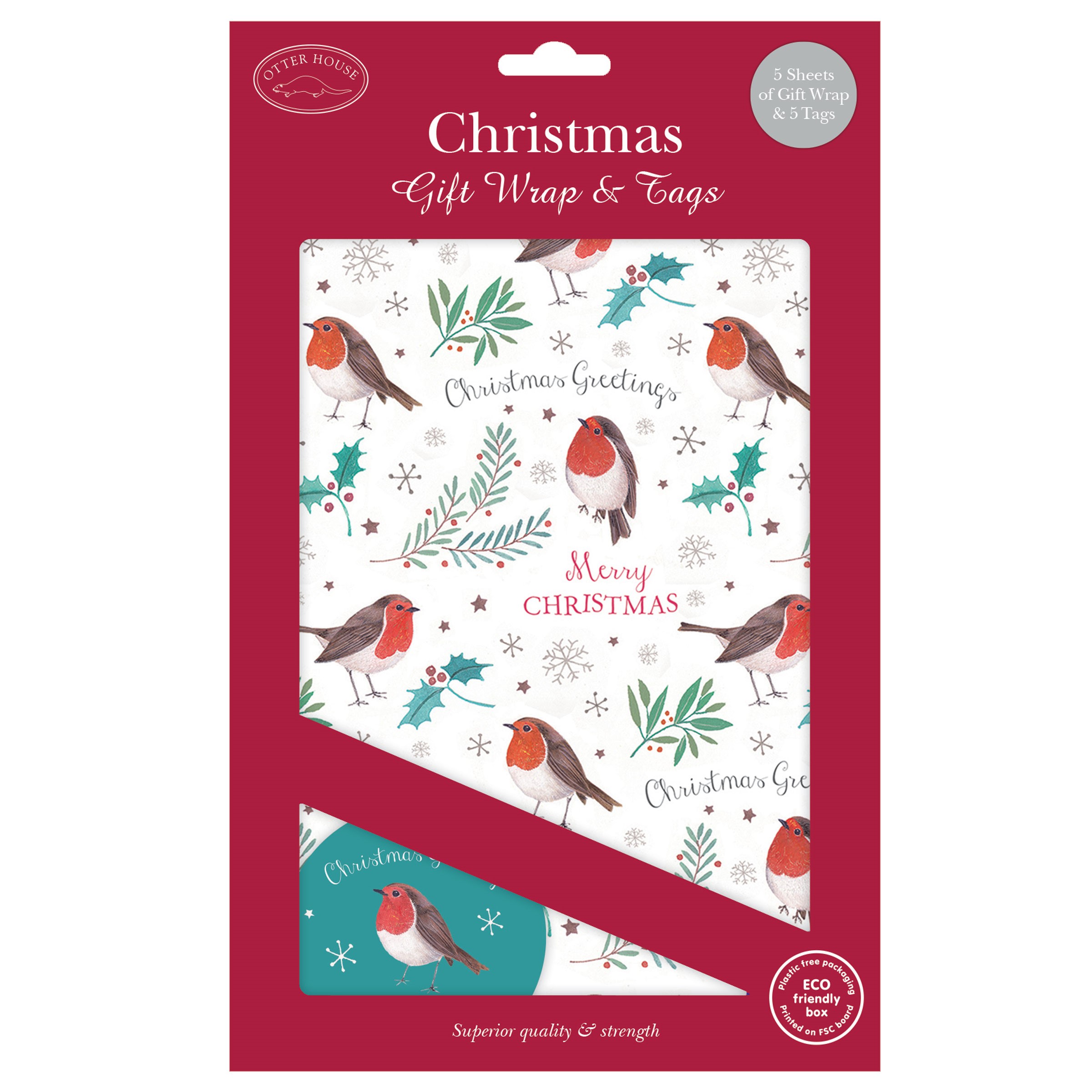 Wrap your Christmas gifts in this gorgeous paper with a charming robin design. Pack contains five wrapping sheets and 5 tags.