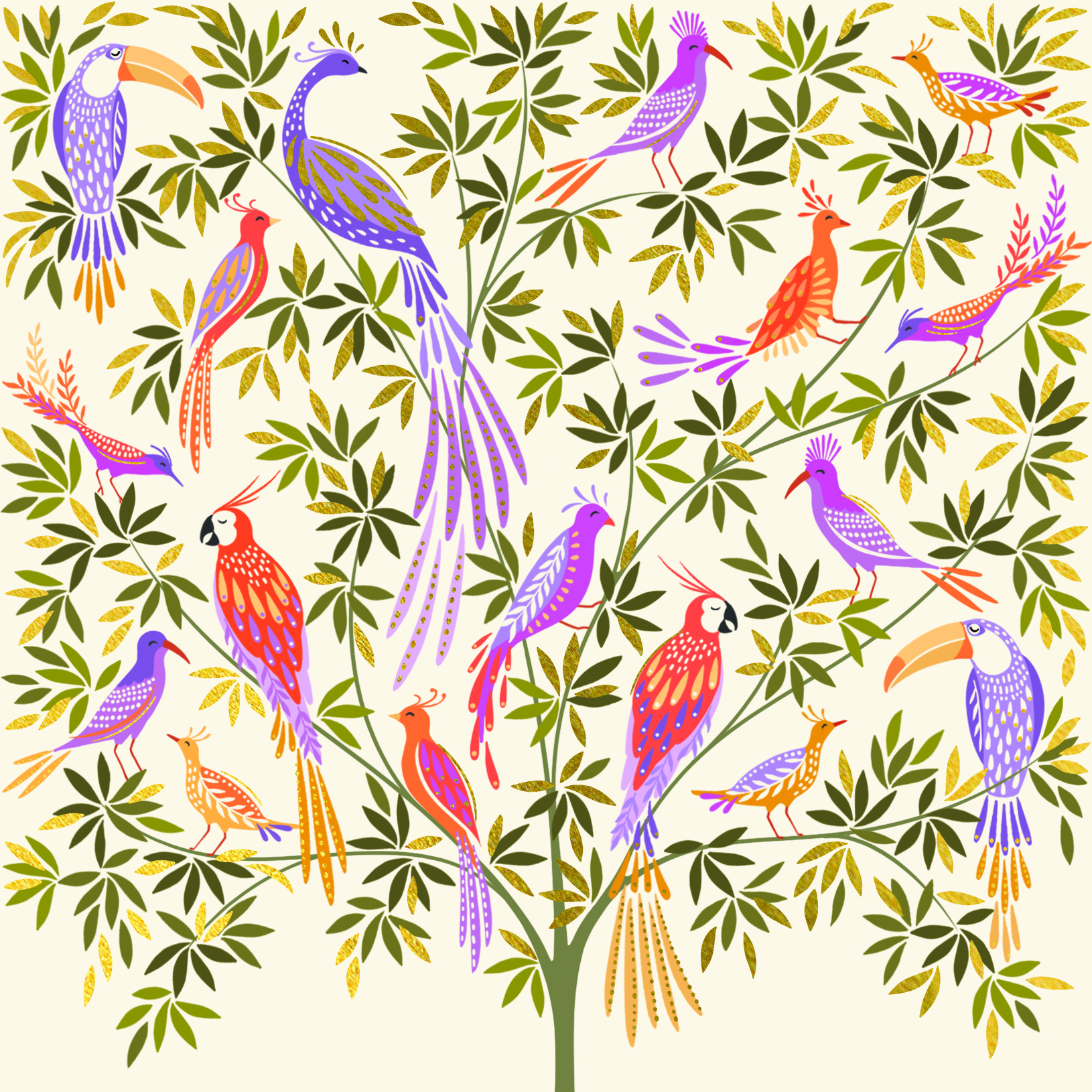 This beautiful Sara Miller card features colourful birds, including peacocks and parrots, all gathered in a tree. It is finished with gold foil and embossing detail.