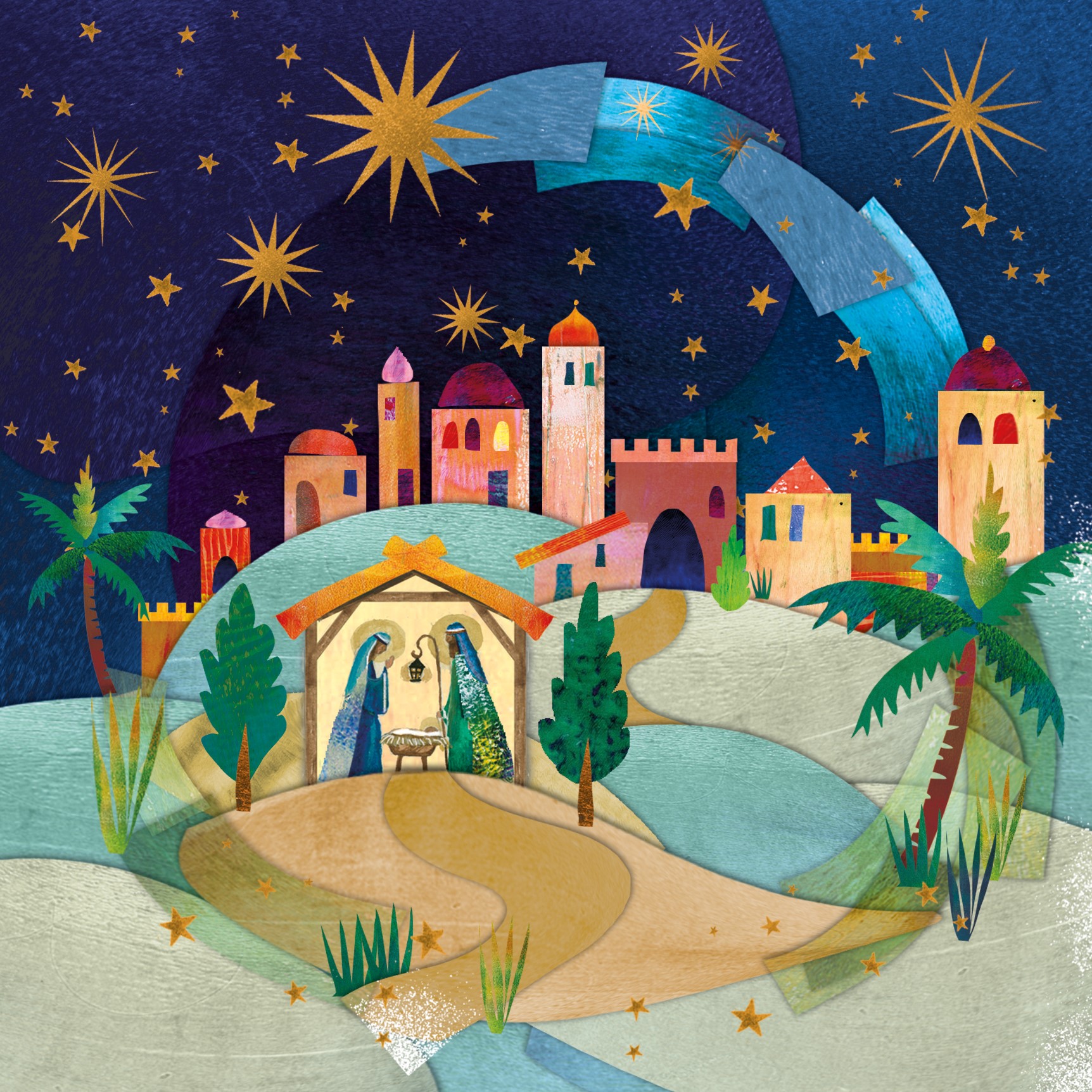 Send your season’s greetings this year with these bright, colourful charity Christmas cards. Mary and Joseph look over their new son, the baby Jesus, as he sleeps in his manger in the stable with the town of Bethlehem beautifully illustrated in the background. The dark blue of the night sky is filled with glorious golden-coloured stars.