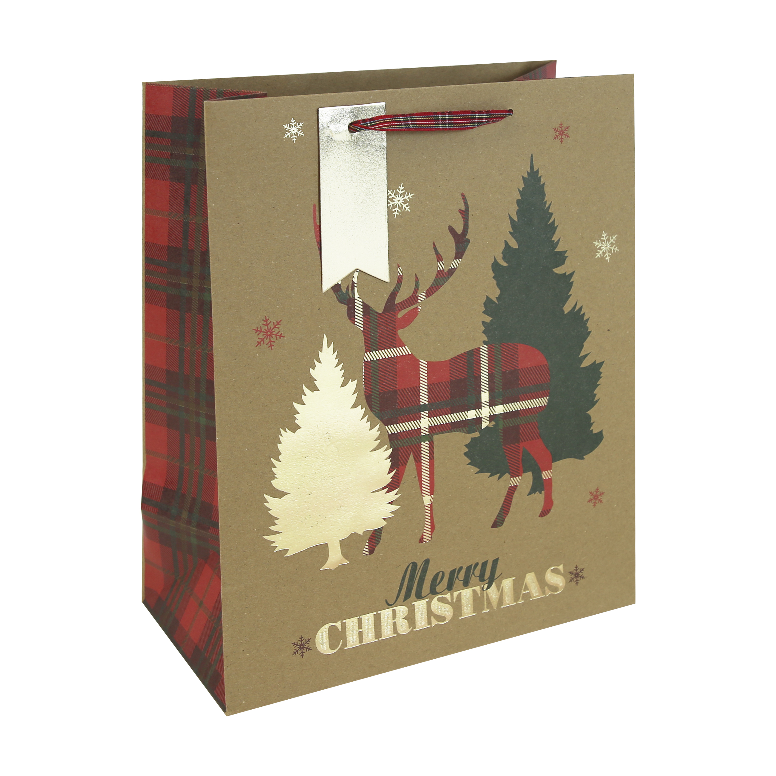 Large kraft bag with tartan stag, festive trees, and “Merry Christmas” text, ideal for big gifts.