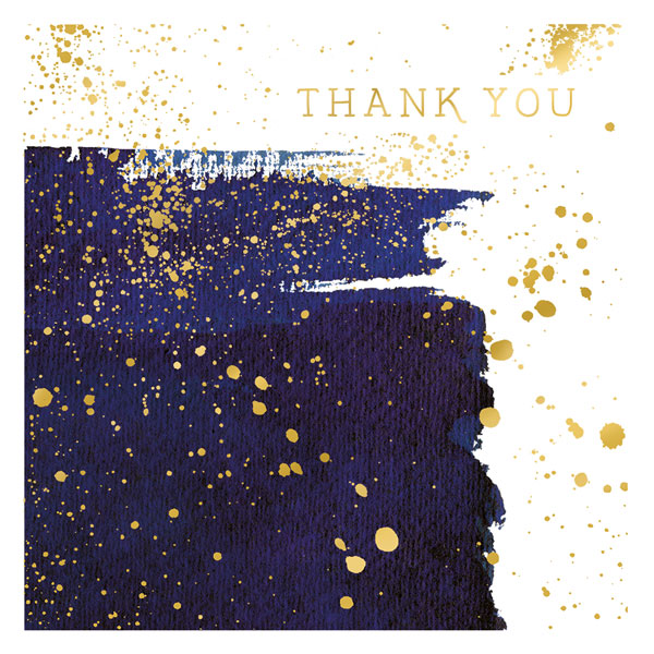 This striking, abstract card features splashes of gold and navy blue. The text ‘Thank you’ is on the front of the card in gold text.