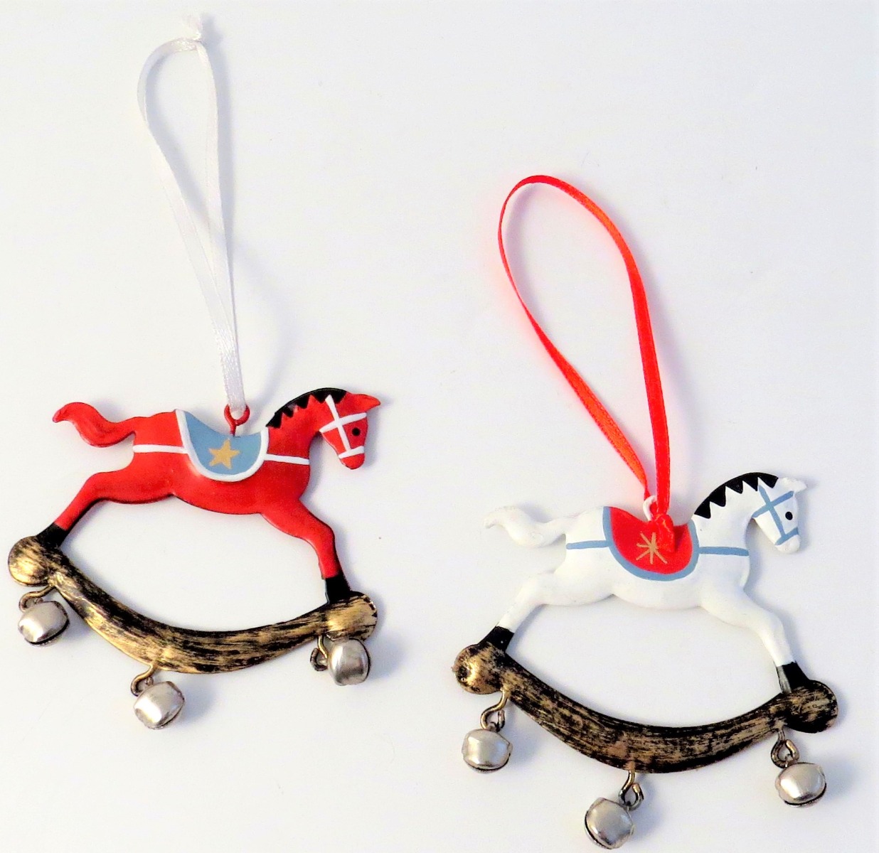 Tin Rocking Horse Tree Decorations in two different colours - red or white. The decorations have ribbon hanging loops and bells on the bottom.