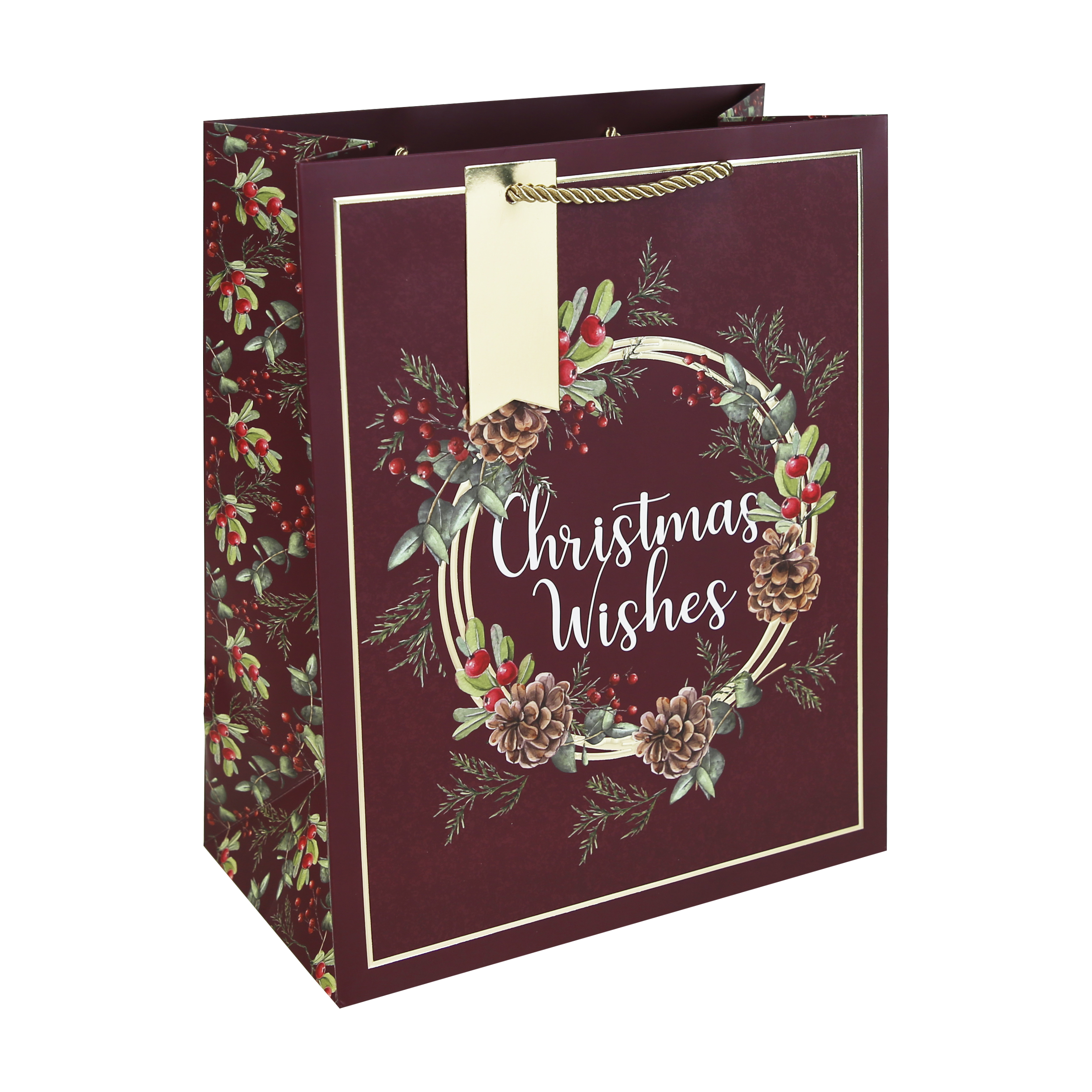 This rich burgundy large gift bag with a festive wreath design and “Christmas Wishes” message. Finished with a gold rope handle and matching tag is perfect for elegant gifting.