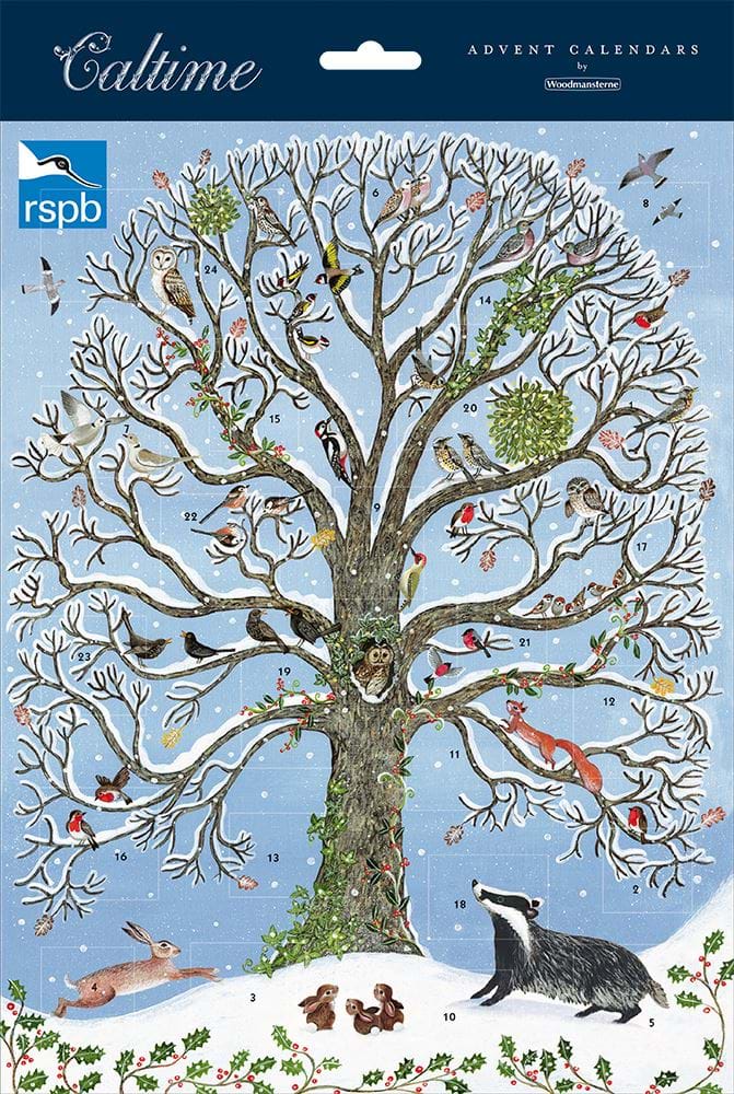 The image on this Advent Calendar shows a large tree with no leaves on. There is an abundance of bird life on the tree including robins, partridges, woodpecker, owls and many more. There is also a squirrel, badger, hare and bunnies. Snow covers the ground